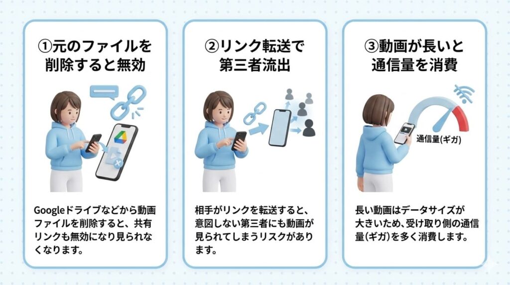 Googleドライブを経由してLINEで動画を送る際の注意点は以下のとおりです。