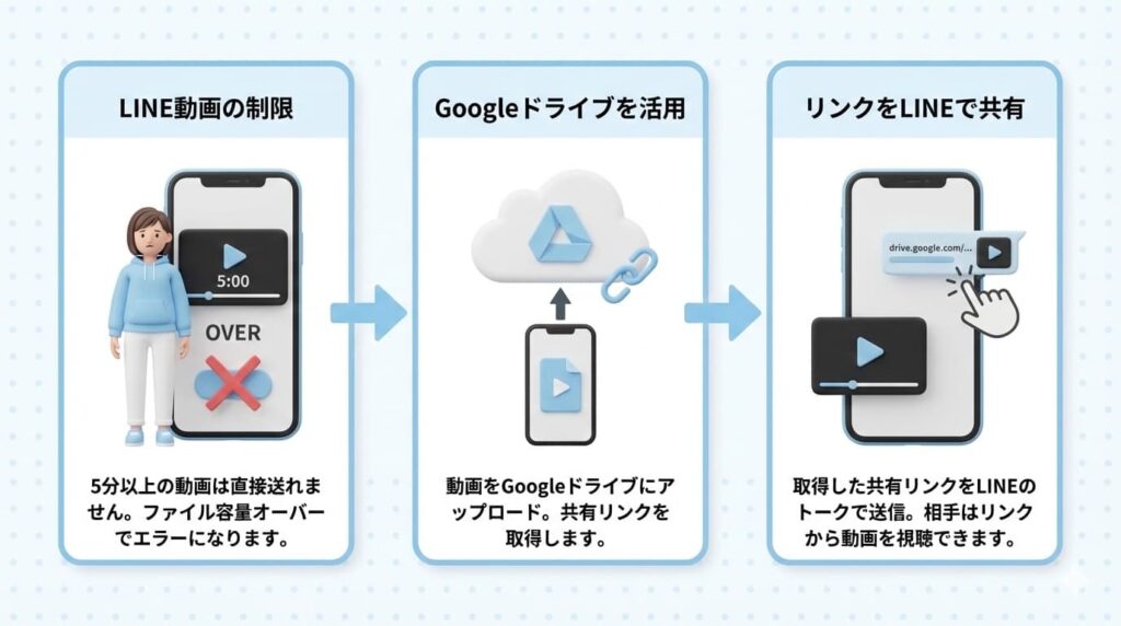 LINEで5分以上の動画が送れない問題は、Googleドライブを使えば簡単に解決できます。